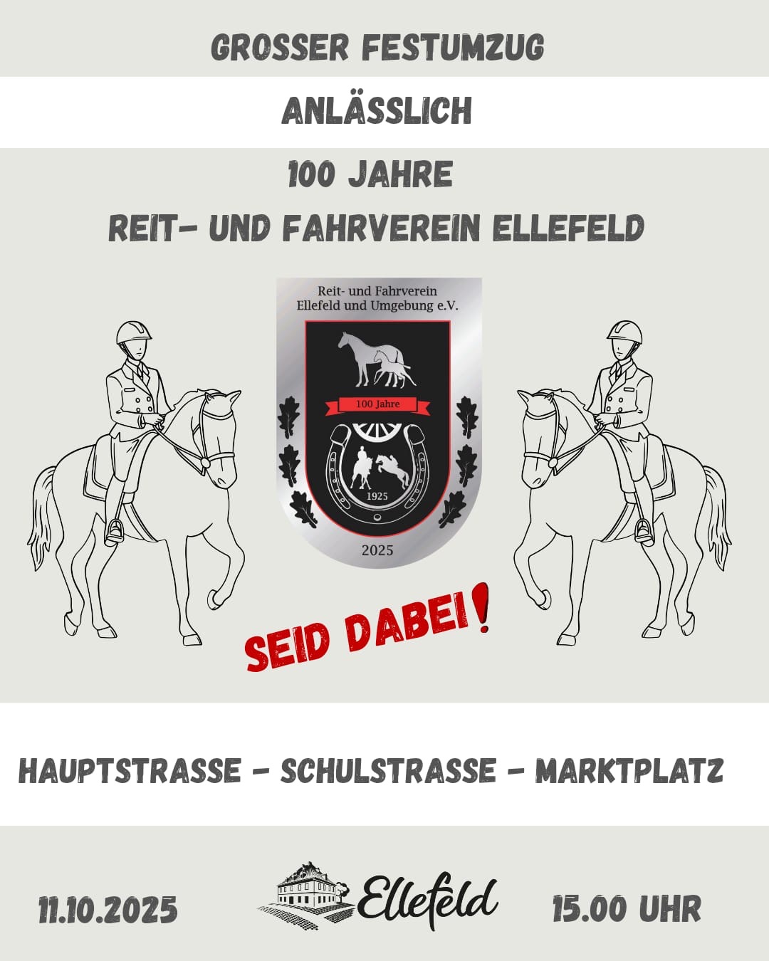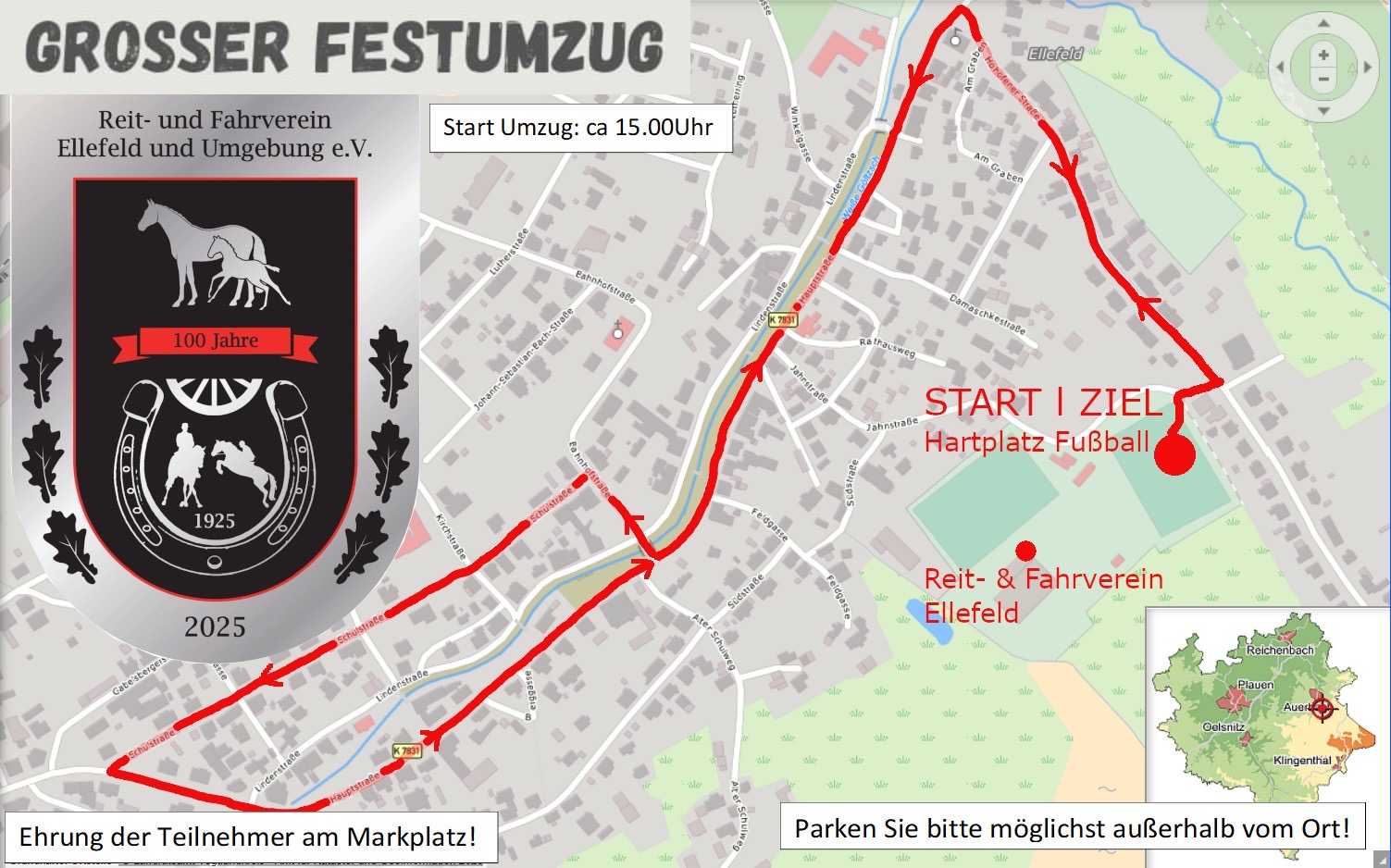 Anlässlich unseres 100jährigen Jubiläums findet am Samstag 15 Uhr ein Festumzug durch Ellefeld statt.